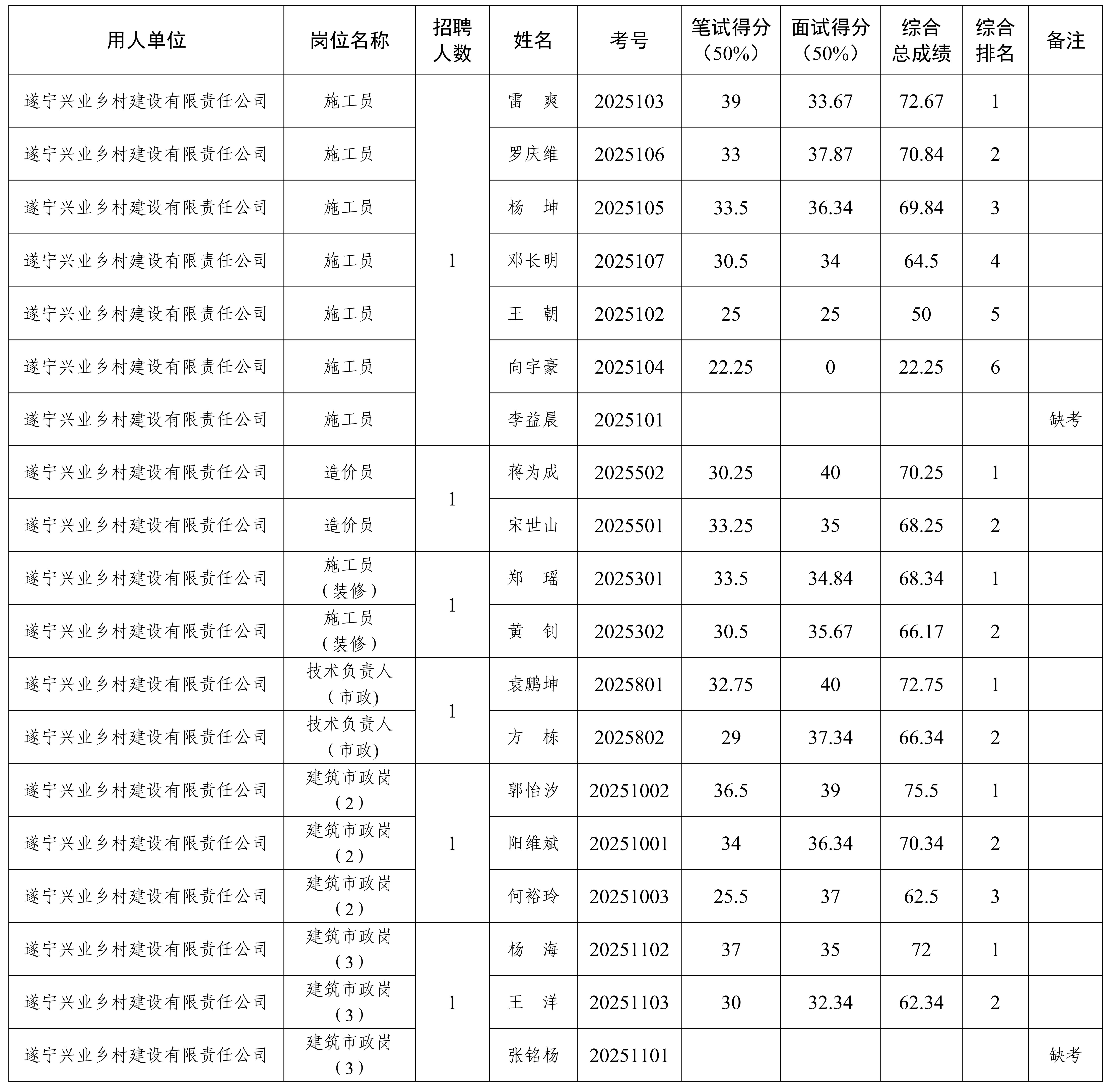 遂寧興業(yè)投資集團(tuán)有限公司 2025年興業(yè)鄉(xiāng)建公司項(xiàng)目合同制用工綜合總成績(jī)排名公示